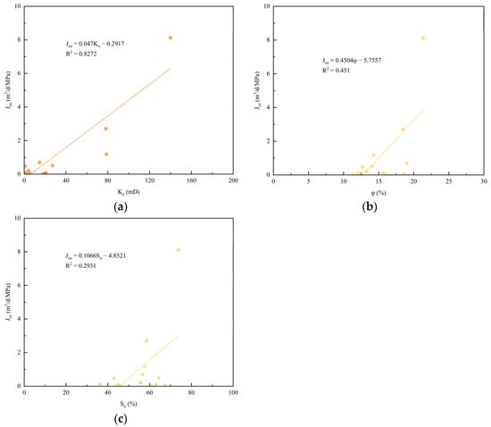 The permeability and porosity only reflect the quality of its physical properties or the size of the liquid production and cannot reflect the fluid properties contained in the reservoir. Oil saturation is a very important factor in the reserve calculation, production evaluation and development plan design. Under the same conditions of reservoir permeability and porosity, the higher the oil saturation, the greater the oil content and oil production. For Figure 5c, the oil saturation range is from 36.4% to 73.7%, and has an average of 54.4%, indicating that the oil reserves in the Beibu Basin are generally poor. The linear curve indicates a poor correlation (0.293) between the oil saturation and the specific oil production index (Table 3).