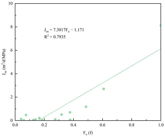 Tight reservoirs exhibit characteristics such as low-permeability, porous media, capillary effects, and significant stress sensitivity [,]. For Figure 5a, the reservoir in the L Formation of the Beibu Basin predominantly features low permeability, with an effective permeability range from 0.0472 mD to 140 mD and an average of 26.451 mD. The reservoir shows strong heterogeneity and poor seepage performance. The linear curve indicates a robust correlation (0.827) between the effective permeability and the specific oil production index (Table 3).