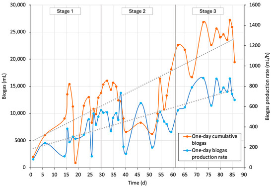 3.4.4. One-Day Cumulative Biogas and Biogas Production Rate