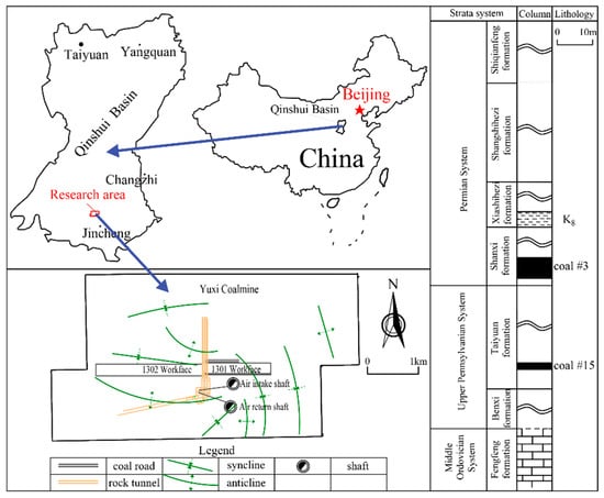 Yuxi Coal Mine is situated in Qinshui County in the southern region of the Qinshui Basin in Shanxi Province, China. The mining area is 26.147 km2 and has a designed production capacity of 2.40 million tons per annum (Mt/a), with an expected operational lifespan of 41.7 a. The primary coal seam currently being extracted is the No. 3 coal seam in the Shanxi Formation (Figure 1). According to the microseismic monitoring data, the depth of the No. 3 coal seam is 590 m, the average vertical stress is 14.5 MPa, the average maximum horizontal principal stress is 16.0 MPa, and the average minimum horizontal principal stress is 8.6 MPa. The coal is classified as No. 3 anthracite, and the quality parameters are detailed in Table 1.