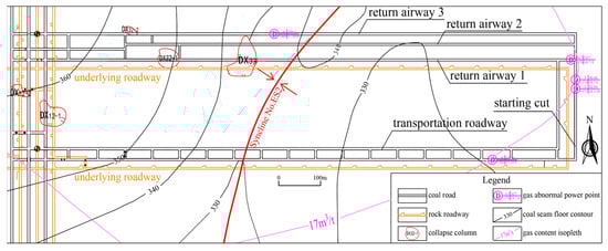 The 1301 working face serves as the initial mining area within Yuxi Mine, spanning 1250 m in strike length and 200 m in dip length. The geology of this working face exhibits relative simplicity, positioned on a large reginal monocline that dips towards the west at an angle of 3–6°. There are a few faults, although the collapse column has been well developed (Figure 1). Considering the high gas content, the ventilation system comprises two intakes and three return airways, as depicted in Figure 2. The roadway heading dimensions are 3.8 m in height and 5.8 m in width. As part of the initial preparations, two GPDURs have been completed, utilizing drilling and pre-drainage techniques to mitigate gas outbursts and prioritize safety (Figure 2).