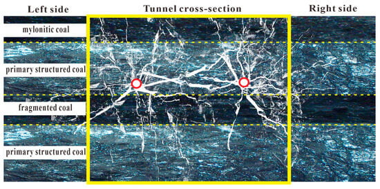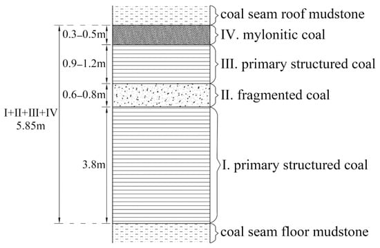 The No. 3 coal seam exhibits a thickness that ranges from 5.12 to 7.20 m, with an average thickness of 5.85 m. This coal seam is characterized by a simple structure, consistent thickness, and is deemed fully recoverable across the entire area. The roof of the coal seam comprises mudstone, sandy mudstone, and siltstone, while in certain regions, fine-grained sandstone is prevalent. The floor consists of black carbonaceous mudstone, creating favorable conditions for gas preservation. In terms of composition, the coal seam primarily consists of bright coal with original undeformed structures, characterized by its hardness and protodyakonov coefficient (f-value), which ranges from 0.8 to 1.0. Within the middle to upper section, there exist two layers of TDC layers with a soft property (Figure 3). The upper TDC layer is mylonitic coal with a thickness of 0.3 to 0.5 m. It lacks discernible bedding planes, possesses a soil-like luster, and exhibits a fragile structure. The f-value of this layer generally ranges from 0.1 to 0.5. These characteristics align with typical outburst-prone coal, and all instances of abnormal gas emission have been observed within this upper layer. One meter to 1.8 m below the roof, there lies an unstable fragmented coal layer with a thickness varying from 0.5 to 0.8 m. Although the deformation degree is less pronounced compared to the upper one, this layer primarily consists of cataclastic and fragmented coal, characterized by disturbed bedding planes. It exhibits low hand-test strength and exemplifies angular and fragmented features. The f-value for this layer ranges from 0.3 to 0.5. No gas outbursts have been observed within this layer.