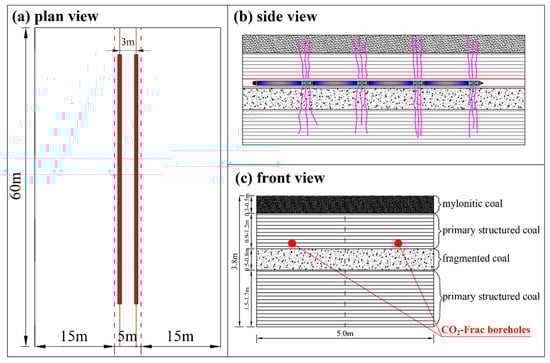The average effective radius of a single fracturing borehole is about 4.5 m [41]. According to the principle of uniform and intensive fracturing, the distance between two parallel hole segments is 3–5 m. Double fracturing boreholes, 1 m from the roadway walls (Figure 4), are drilled parallel to the direction of roadway excavation using a 113 mm bit. The depth of the boreholes ranges from 60–80 m, each borehole is equipped with 15–30 sets of fracturing tubes, and the length of the fracturing section is 30–60 m. It is a key rule that a strict control is exercised within the fracturing section that was evaluated as having no outburst risk during the subsequent excavation after the fracturing, with over-excavation being prohibited.