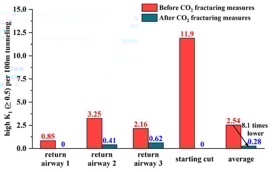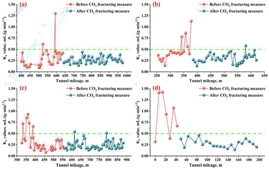 Quickly reducing gas content as well as then the outburst risk is the key function of CO2-Frac, which can be clearly illustrated by the large amount of reduced K1 tests after CO2-Frac, as shown in Figure 5 and Figure 6. Review Equation (3), where K1 is directly proportional to the gas content Q1 of the coal cutting samples. The lower K1 tests after CO2-Frac means that the gas content has dropped low and the outburst risk has been mitigated. Thus, we are confident that CO2-Frac can quickly reduce gas content through the highly developed artificial fracture system and then mitigate the outburst risk, since gas content always plays the most important role in inducing the coal and gas outburst. Chinese coal mining regulations defined that when the gas content is higher than 8 m3/t, the coal bears outburst risk, and the coal is without outburst risk when the gas content is lower than 8 m3/t.