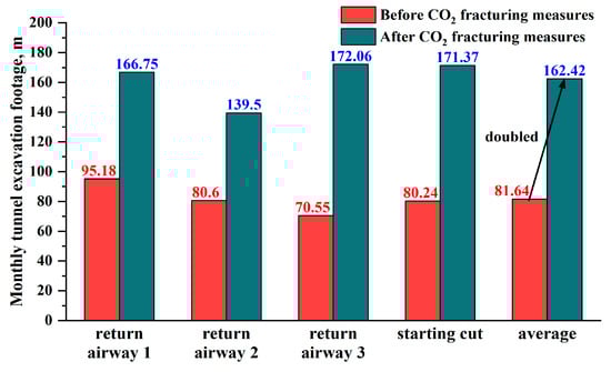 After CO2-Frac, the monthly excavation of the roadway is significantly increased. As shown in Figure 8, the average monthly footage of return airway 1, return airway 2, return airway 3, and starting cut was 95.18 m, 80.6 m, 70.55 m, and 80.24 m, respectively, with an average monthly footage of 81.64 m. After using dual-hole CO2-Frac, the monthly excavation footage of the four tunnels reached 166.75 m, 139.50 m, 172.06 m, 171.37 m, respectively, with an average of 162.42 m. The monthly excavation significantly increased by 0.75 times, 0.73 times, 1.44 times, and 1.14 times, respectively, with an average increase of 1 time (Figure 8). This indicates that CO2-Frac is an effective technical measure for secondary outburst prevention and rapid excavation in the outburst-prone coal seam in Yuxi Coal Mine.