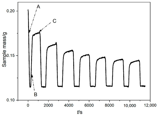 Figure 3 shows the initial TGA curve of limestone after seven cycles of calcination/carbonation. In Figure 3, stage A represents the calcination and decomposition process of limestone at high temperature. Due to the release of a large amount of CO2, the total mass of the limestone decreases rapidly. Stage B reflects the rapid carbonation process of the calcined product, which is mainly the absorption reaction of CaO to CO2. The gas precipitation during the initial calcination makes the surface of CaO rich in micropores, which is conducive to the rapid diffusion of CO2 and the interaction with CaO particles in the full reaction; therefore, at the beginning of the carbonation process, the TG curve is reflected as a rapid increase in sample mass. However, as the carbonation of the solid sample proceeds, CaCO3 generated on the surface of the CaO particles blocks some of the pores and hinders the further carbonation reaction between CO2 and CaO inside the pores, resulting in a significant decrease in the carbonation rate. At this moment, one cycle of CaO calcination/carbonation is over.