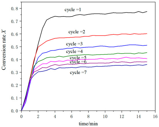 As the number of cycles increases, the absorption capacity of CaO for CO2 decreases significantly. The relationship between the number of cycles and the degree of carbonation is shown in Figure 4. It can be observed in the figure that the initial stage of the reaction is the chemical reaction control stage where the reaction rate is very fast; then, the increased rate of the reaction conversion rate is significantly reduced, and finally, the change trend tends to be gentle, entering the product layer diffusion control stage [16]. It should be pointed out that, from the effect of over-sintering, the selection of seven cycles has met the requirements of this work.