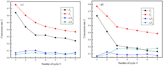 Comparing the changes in the curves in Figure 7, it can be observed that, under the four conditions, X1 decreases with the increase in the number of cycles, but the trend of the change is different. Taking the a condition as a reference value, under the b working condition, X1 is smaller, but as the number of cycles increases, the rate of decrease gradually slows down; the c condition decreases rapidly during the first three cycles, but the change in X1 gradually decreases in the subsequent cycles. The change trend of X1 under the d working condition is similar to that under the c working condition, except it decreases more significantly. In addition, the change in ΔX1 is not obvious under the four conditions, and ΔX2 only increases slightly under the d working condition. Overall, Figure 8 shows that the decrease in CaO reactivity is mainly caused by the decrease in X1, and the different sintering conditions have different effects on the decrease in activity.