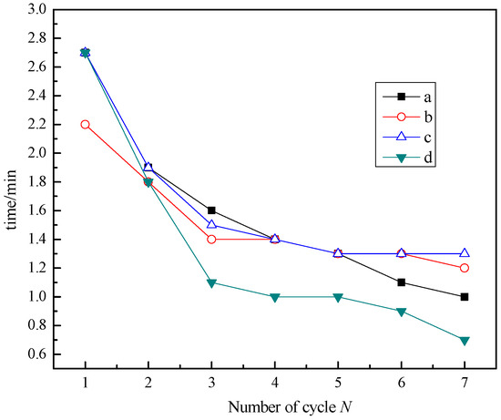 Further analysis revealed that the decline of X1 is related to the early end of the chemical reaction control phase. As shown in Figure 8, the end times of the chemical reaction control stage under the four conditions all advance with the increase in the number of cycles, and the variation range is different under different sintering conditions. Among them, under the b condition, the end time of the first three cycles of the chemical reaction control phase is earlier than the a condition due to the excess sintering of the first cycle. The change trend of the c condition is basically the same as that of the a condition, while the d condition has a larger decline, and the end time of the chemical reaction control stage after the third cycle is far ahead of the a condition.