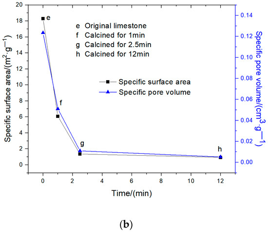 As shown in Figure 9, the pore distribution of the calcined/carbonated products changes regularly with the progress of the calcined/carbonated reaction. As can be observed in Figure 9a, the original limestone is basically non-porous, so its specific surface area and specific pore volume are very small. After 1 min of calcination, the double peaks were prominent, and micropores, medium pores and large pores appeared, but the total number of the three kinds of pores was small, so the specific surface area and specific pore volume of the calcined products were still small at this time. After calcination for 2.5 min, the first peak changed little, but the peak value of the second peak increased rapidly, indicating that the middle pore formed sharply and promoted the ratio table.
