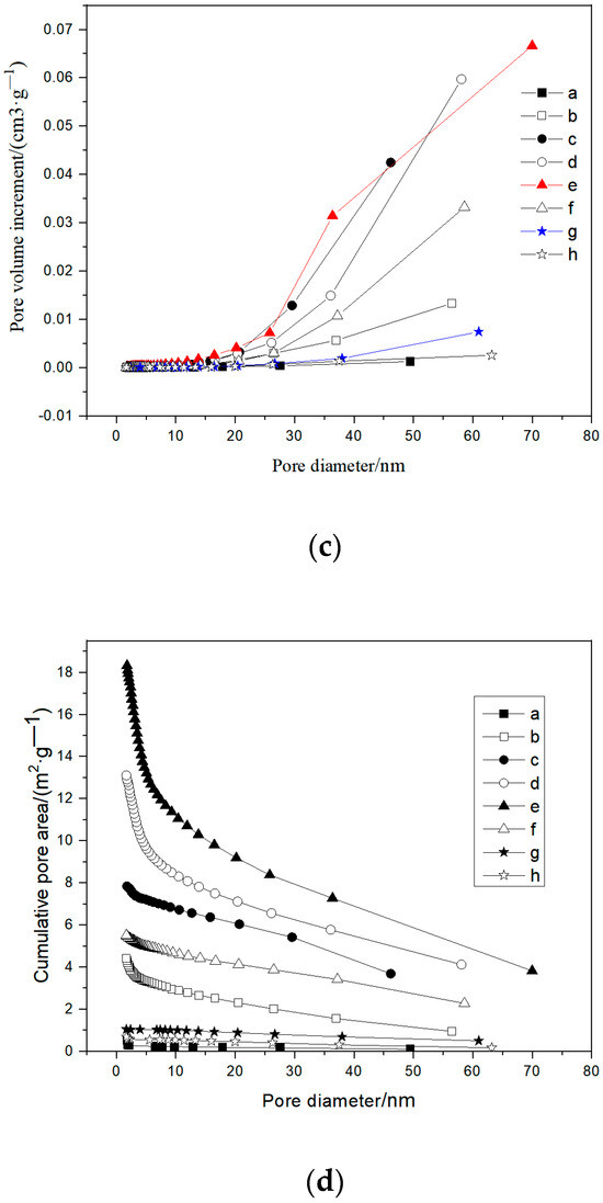 The pore distribution of the products in the process of calcination/carbonation of limestone includes pore area distribution and pore volume distribution, which show the pore area and pore volume occupied by different void sizes. The study of pore distribution can better show the changes in pore structure in the process of calcination/carbonation of limestone. According to IUPAC’s classification of pore size, a pore size less than 2 nm is a micropore, a pore size between 2 and 50 nm is a mesopore, and a pore size greater than 50 nm is a macropore [21]. A micropore provides a huge inner surface for the reaction, a middle pore is the main channel into a micropore, and a large pore is a rough channel for transporting the reaction component.
