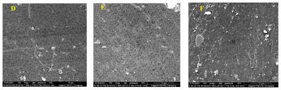 SEM images were used to examine the impact of PCLNPG pore former content on the membrane surface and cross-sectional morphologies. Figure 1A shows that the membrane made from pristine PPSU (0 wt.% PCLNPG) had a solid, flat layer with tiny pores that were hardly noticeable on the surface. However, Figure 1B–F demonstrate that the PCLNPG significantly altered the surface morphology of the modified membranes. As the PCLNPG was increased to 1 wt.%, the changed membranes showed signs of increased pore density and larger pores when compared to the top surface of virgin PPSU. A denser surface began to emerge once more beyond this percentage (Figure 1F). This is most likely to be brought on by the casting solution’s high viscosity, which was made with the highest possible PCLNPG concentration. Denser morphologies were the outcome of the increased viscosity, which caused a delayed mixing–demixing between the solvent (NMP) and nonsolvent (water) during phase separation [27].