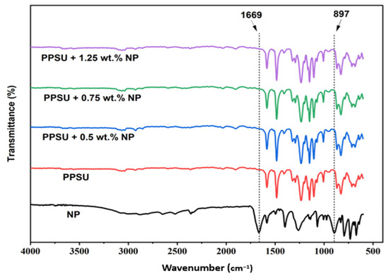 The potential of FTIR to distinguish between different functional groups on membrane surfaces and their possible molecular interactions makes it a highly valued and frequently used characterization tool. Figure 3 presents the FTIR spectra of the unmodified PPSU and modified membranes with varied PCLNPG additions. All of the membranes displayed the distinctive PPSU FTIR spectra, which were the same as those of the pristine membrane. In particular, the anti-symmetric stretching peak of the O=S=O group was found at 1234 cm−1, whereas the symmetric stretching absorption peak of the same group in PPSU was observed at around 1148.69 cm−1 [32,33]. Moreover, two distinct peaks at 1493 cm−1 and 1590 cm−1 were found to be caused by the stretching vibrations of the benzene ring (C=C). Similar characteristic peaks were also reported in [34,35,36]. The bands at 897 and 1669 cm−1, which were only visible on the PCLNPG, completely disappeared from the membranes that were ready for the PPSU/PCLNPG, according to the PCLNPG spectra. The peak at 1669 cm−1 displays the C=O stretch. This double bond permits interaction with the PPSU polymer, suggesting that pores were left behind when the PCLNPG was hydrolyzed. The PCLNPG structure’s high hydroxyl group (OH-) content also contributed to this kind of degradation by promoting hydrogen bonding with water during phase inversion. The observations made here agree with the conclusions made by Kadhum et al. [20]. When the pore former content was changed, the spectra of the membranes incorporating PCLNPG did not significantly change. This result was anticipated, since PCLNPG is expected to leach after film formation.