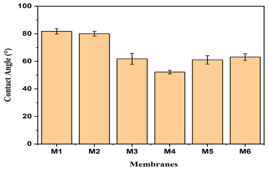 Determining a membrane surface’s wettability is essential for studying its fouling behavior. The membrane surface affinity with water is evaluated by the water contact angle [37]. The contact angle data for both virgin and modified PPSU membranes are shown in Figure 4. Increasing the PCLNPG increased the membrane hydrophilicity. When compared to membranes modified by PCLNPG, the pristine PPSU membrane’s contact angle (CA) measurement was determined to be the highest at 81.7°. A small decrease in the CA value was seen when PCLNPG was added to the polymeric matrix at a wt.% of 0.25, recording 80°, compared to 60.3° when the same content was doubled to 0.5 wt.%. Using 0.75 wt.% PCLNPG produced the lowest CA value of 52.2°. This decline could be caused by changes in the pore density and size. At 1.0 and 1.25 wt.%, the membrane contact angle rose to 61.0° and 63.1°, respectively. The increases in contact angles for 1.0 and 1.25 wt.% PCLNPG as opposed to 0.75 wt.% PCLNPG were caused by the reduction in both porosity and mean pore size.