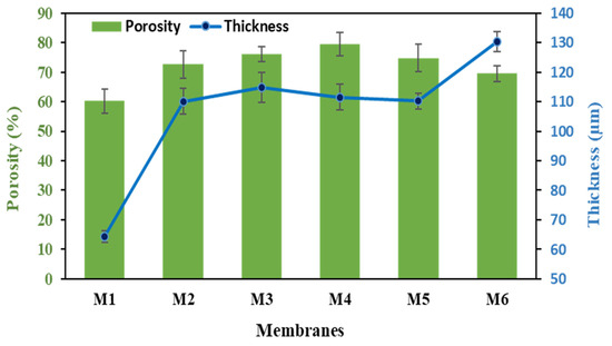The dry/wet approach was utilized to evaluate the porosity of the prepared membranes. Membrane samples measuring 10 × 10 cm2 were cut, and the dry weights of the samples were noted. After that, the samples were soaked in deionized water (DI) for a whole day. The excess water was removed using soft tissue, and the samples’ wet weights were measured. Equation (1) was utilized to calculate the produced membranes’ porosity (ε) [21].