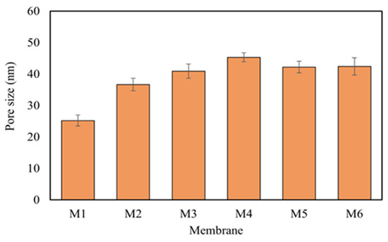 Alongside other surface characteristics, the pore size and its distribution are important in determining a membrane’s permeability and selectivity. Figure 6 illustrates the impact of varying PCLNPG percentages on PPSU membranes’ pore size. The pristine PPSU membrane demonstrated an average pore size of 25.2 nm, the smallest among all modified membranes. However, incorporating the PCLNPG nanopolymer significantly increased the pore size in the nanocomposite membranes, with the largest pore size of 45.3 nm observed in the 0.75 wt.% PCLNPG membrane. This increase is likely due to the enhanced thermodynamic stability of the casting solution induced by the PCLNPG addition, which accelerates the solvent and nonsolvent exchange rate, leading to the formation of larger pores and higher pore density. Conversely, increasing the PCLNPG content beyond this concentration led to a slight decrease in pore size, reducing it to around 42.2 nm and 42.4 nm for the 1 wt.% and 1.25 wt.% membranes, respectively. This reduction is attributed to the slight viscosity increase of the casting solution at higher PCLNPG concentrations, which curtails the solvent and nonsolvent exchange during the phase separation process. This results in reduced porosity and pore sizes, and decreased membrane thickness. The results observed in the membrane morphology as captured by SEM images support these findings. According to Hong and He [40], the solvent and nonsolvent (water) exchange velocity is a key determinant of pore size. Previous studies have demonstrated that rapid or immediate solvent–nonsolvent demixing processes tend to produce membranes with larger pore sizes [41,42,43]. These observations align with the results obtained in this study, highlighting the intricate balance between casting solution composition, phase separation dynamics, and the resulting membrane properties.