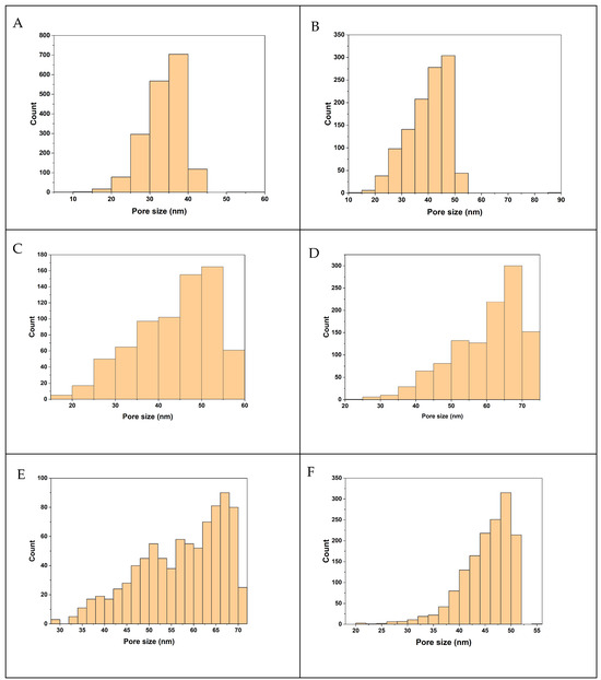 Pore size distribution of membranes (A) 0 wt.% PCLNPG, (B) 0.25 wt.% PCLNPG, (C) 0.5 wt.% PCLNPG, (D) 0.75 wt.% PCLNPG, (E) 1.0 wt.% PCLNPG, and (F) 1.25 wt.% PCLNPG.