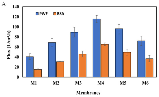 (A) Pure water and BSA solution fluxes; (B) rejection of BSA.