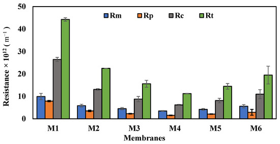The different resistances were computed using Equations (5)–(9) to assess the degree of membrane fouling during filtration [25,26].