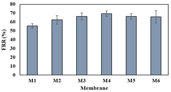The flow recovery ratio (FRR) was calculated to gauge the membranes’ antifouling potential in greater depth. Measurements of pure water flux were made following BSA filtration to evaluate the reusability of the membrane. All membranes were washed with deionized water for an hour under non-pressurized conditions prior to recording the PWF. Better antifouling properties are correlated with a larger FRR, which is suggestive of a reduced degree of BSA adherence to the membrane surface [47]. All composite membranes including PCLNPG nanopolymer disclosed greater FRR values than the pristine PPSU membrane (M1), which had the lowest FRR of 55.62%, as shown in Figure 10. The incorporation of 0.25 wt.% and 0.5 wt.% of PCLNPG in the polymeric matrix resulted in FRR values increasing to 63.2% and 66.1%, respectively. The M4 membrane, which incorporated 0.75 wt.% PCLNPG, exhibited the highest FRR value of 69.45%. However, a slight reduction in FRR values to 66.33% and 65.8% was observed when the PCLNPG concentration was further increased to 1.0 wt.% and 1.25 wt.%, respectively. Despite this decline, the FRR values of the modified membranes remained significantly higher than those of the unmodified PPSU membrane.