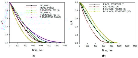 Drying curves (time–moisture Ratio, MR): (a) at different temperatures and constant pressure, (b) at different pressure and temperature conditions during freeze-drying.