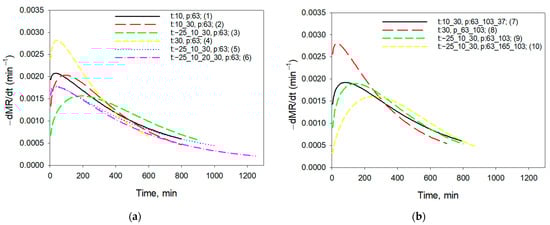 Curves of drying rate (time–drying rate, dMR·dt−1): (a) at different temperatures and constant pressure, (b) at different pressure and temperature conditions during freeze-drying.