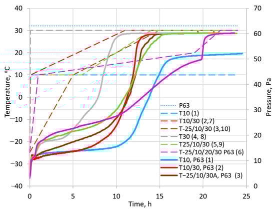 Figure 3 shows the changes in the material temperature during sublimation and the desorption experiments conducted at a constant or variable shelf temperature and a constant pressure of 63 Pa. When the set shelf temperature was 10 °C (T10, P63 (1), Figure 3, blue line), the material temperature changed within the range of −25 to −22 °C during the first 10 h of the process. After this time, almost 87% of the water was removed from the material (Figure 1a).