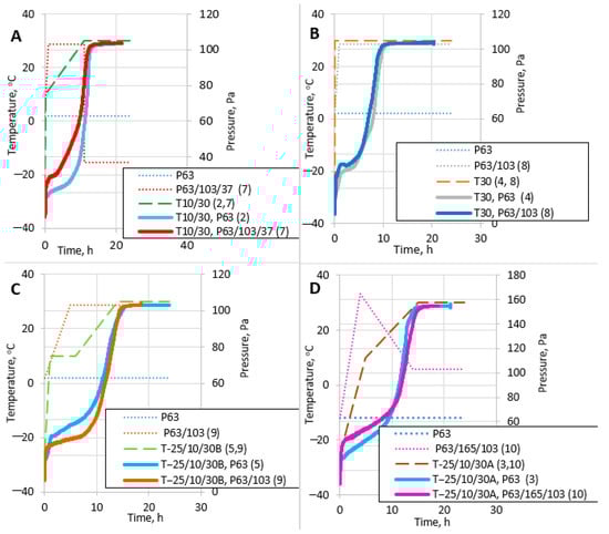 Effect of pressure modification on material temperature during the freeze-drying process: (A) for temperature profile T10/30, (B) for T30, (C) for T-25/10/30B, (D) for T-25/10/30B; dotted line—pressure, dashed lines—set parameters temperature, solid lines—measured temperature during freeze-drying of apple (in the centre of the material).