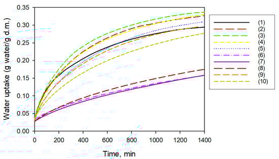 Figure 6 presents the changes in water content during the storage of dried apples in a constant environment with a humidity of 75.3%. The initial water content of the dried apples was similar, and after 24 h of sorption, the moisture content of the materials changed significantly, but to a different extent.