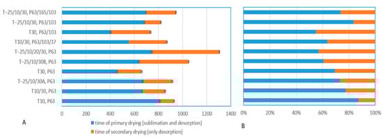 Most of the water was removed in primary drying using the parameters T10, P63 (1), T10/30, P63 (2), and T–25/10/30, P63/103 (9). The average water content in the material at the moment of obtaining the cryoscopic temperature was 0.100 ± 0.001, 0.394 ± 0.007, and 0.258 ± 0.007 g water/g d.m., respectively. Also, during these processes, the lowest water content was found when the material reached a temperature of −10 °C (Table 6). In these processes, the desorption drying time was the shortest, accounting for 12.5 to 22% of the total freeze-drying time (Figure 7). Therefore, the above parameters should be recommended when assessing the process as the most favourable one.