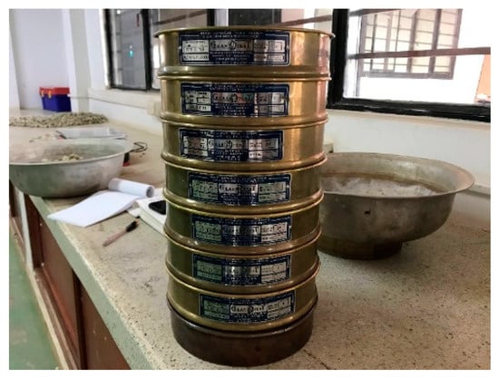 Through this standard, the distribution of sizes of coarse and fine aggregates was quantified. The sieve system specified by the standard was used (See Figure 1) [].