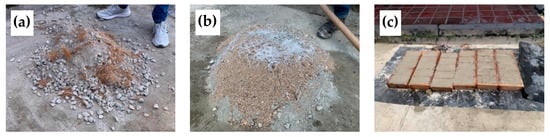 The mixture of synthetic and organic fibers (PET and coconut fiber) with concrete is shown in Figure 2. Considering the previously established experimental design, it is important to note that each mixture contained a different dosage. Additionally, Figure 3 depicts the curing process of the pre-formed cobbles. Note that the mixtures were prepared according to fiber addition percentages, with 20 cobbles made daily and de-molded after 24 h.