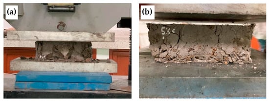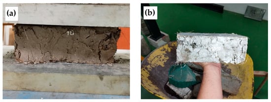 Visually, it was observed that the cobbles with the addition of coconut at any percentage showed less failure during both compression and flexural testing compared to cobbles containing only PET or 100% concrete, as depicted in Figure 4. Figure 4a shows the cobble with 100% concrete, while Figure 4b displays a cobble with a 5% addition of coconut fiber. It can be observed that the crack or failure amplitude is smaller in the cobble containing the organic fiber.