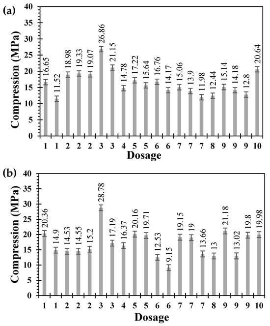 Table 1 shows the experimental design proposed for executing the dosages to obtain the cobbles for experimental tests. Note that some dosages are replicated because the statistical software (Statgraphics version 19) optimizes the combinations to reduce the test amount, as presented in Table 2. This experimental design is part of the initial observation and previous works, ensuring that the study’s findings are grounded in a robust methodological framework. By systematically varying the proportions of concrete, coconut fiber, and PET fiber, it was possible to develop eco-cobbles with enhanced mechanical properties and environmental sustainability.