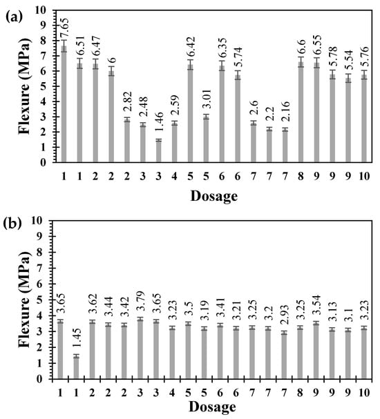 With a tensile strength of 300–500 MPa and Young’s modulus (E) of 10–30 GPa, cellulose fibers significantly altered the post-crack behavior of mortar. Increasing the fiber content improved the material’s deformation capacity due to the fibers’ energy absorption and tensile stress transfer capabilities []. Known for their tensile strength of 500–700 MPa and E of 4–7 GPa, PET fibers enhanced flexural tensile strength but showed mixed results for compressive strength depending on fiber dispersion []. In the case of sisal and jute fibers, values can differ widely in tensile strength (200–800 MPa) and E (10–80 GPa), improving flexural properties but could negatively impact compressive strength if not uniformly dispersed [].