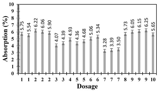 Regarding water absorption, none of the mixtures exceeded the NTC 2017 limit of 8%. However, coconut fiber mixtures demonstrated higher absorption rates. The highest absorption occurred in the 10% coconut fiber mix (mixture 9), whereas PET fiber mixtures had lower absorption, particularly with 10% PET fiber (mixture 7). This increased absorption with coconut fiber may be linked to reduced flexural strength at 28 days due to ongoing curing.