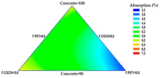 Contour plots from the response surface graph highlight that high compression strengths are associated with minimal coconut fiber content. Flexural strength is higher at early ages without PET fiber and decreases with PET fiber presence by 28 days. Absorption is lower with 10% PET fiber, as shown by the dark blue in the PET fiber corner, with higher absorption values indicated by reddish tones.