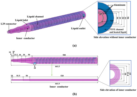 The geometry of the simulation model (unit: mm). (a) Overall diagram of the model and side elevation without inner conductor. (b) Side elevation of the model and inner conductor.