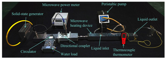 To confirm the accuracy of the simulation model, experiments were conducted. The experimental setup, as shown in Figure 2, used a solid-state generator (WSPS-2450–1 K-ccwb, Wattsine, Chengdu, China) to provide microwave input, delivering energy to the coaxial heating device through a waveguide coaxial converter and a circulator (CIWG22–2450-2KWA101010, Euler Microwave, Chengdu, China). The microwave input power was set to 200 W with a frequency of 2.45 GHz. The opposite terminal of the circulator is linked to a water load for absorbing the reflected microwaves and safeguarding the solid-state generator. A directional coupler (Loop-E22DC40A10N, Euler Microwave, Chengdu, China), a microwave power meter (AV2433, 41st Institute of China Electronics Technology Group Corporation, Hefei, China) and the liquid sample (Wahaha Co., Ltd., Hangzhou, China) in the microwave heating device constituted the microwave power measurement system. The flow rate of the incoming liquid was controlled by a peristaltic pump (V-3 L, Baoding Shenchen Pump Industry Co., Ltd., Baoding, China), and the temperature at the center of the liquid outlet was measured using a thermocouple thermometer (TP678, MITIR, Wenzhou, China).