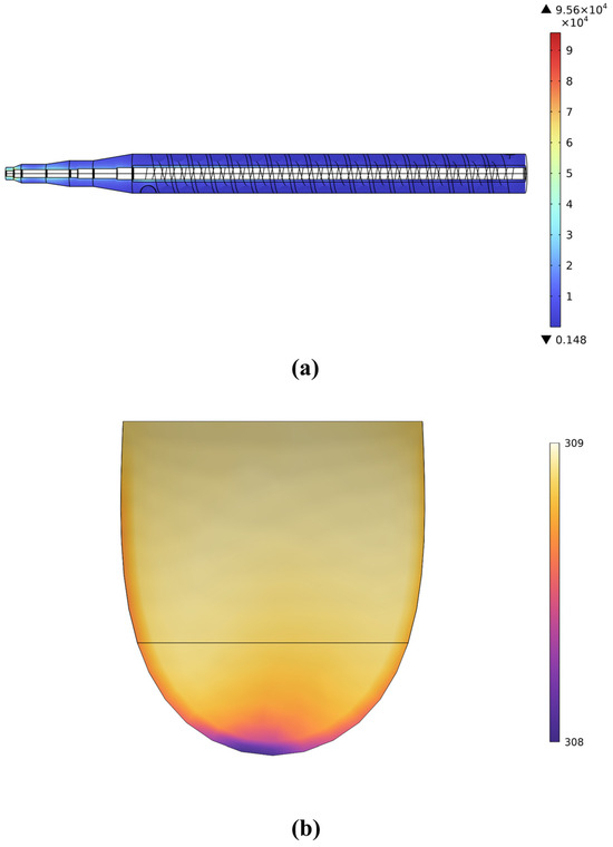 Simulated field distribution. (a) Electric field distribution in the heating device. (b) Temperature field distribution at the liquid outlet surface.