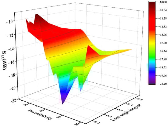 Figure 7 shows the corresponding changes in the S11 parameter as the loss tangent of the heating liquid varies from 0.1 to 0.5. It can be seen that the heating efficiency of the device remains relatively stable with changes in permittivity and loss tangent. When the loss tangent is between 0.2 and 0.5, the S11 parameter is below −10 for all permittivity loads, indicating an efficiency of over 90%. Only when the loss tangent is 0.1 does the S11 parameter exceed −10 for some permittivity loads. This indicates that the proposed microwave heating device has very good efficiency stability.