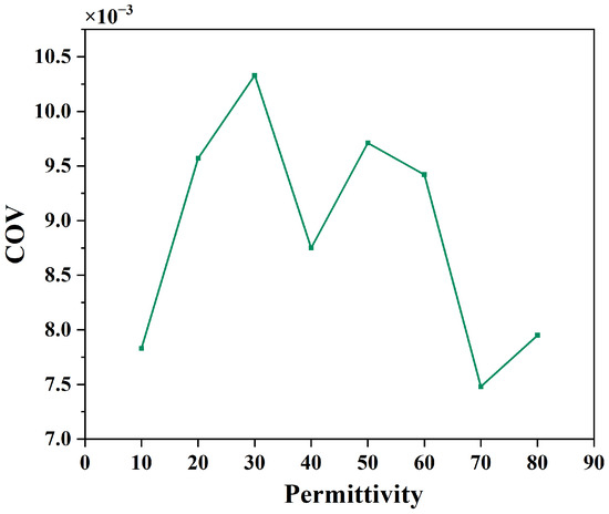 Figure 8 illustrates the variation of the COV at the outlet cross-section of the liquid under conditions where the permittivity changes from 10 to 80 in increments of 10. It can be seen that the COV at the outlet of the heated liquid is consistently below . This result indicates that the proposed device provides great heating uniformity for liquids with different permittivity.