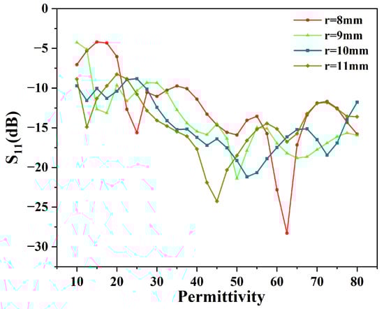 The radius of the helical liquid channel significantly affects the efficiency of this heating device. Simulations were conducted using COMSOL software to model different radii of the helical liquid channel. The channel radius varied from 8 to 11 mm in 1 mm increments, while maintaining a constant number of turns in the helical pipe, resulting in a fixed pitch of 25 mm. The operating frequency was set at 2.45 GHz with an input microwave power of 200 W. In the simulation analysis of the microwave device’s S11 parameter, the initial temperature of the heated liquid was 293.15 K. The permittivity varied from 10 to 80 in steps of 2.5, with a loss tangent of 0.1. The simulation results for S11 under different size parameters are shown in Figure 9.
