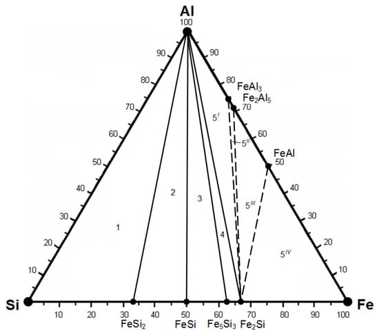 As a result of triangulation of the Si-Al-Fe system (Figure 1) including all complex compounds, five regions have been formed. The incongruent compounds have not been found in regions of Si-Al-FeSi2 (1), FeSi2-Al-FeSi (2), FeSi-Al-Fe5Si3 (3), Fe5Si3-Al-Fe2Si (4). The diagram region of Fe2Si-Al-Fe has one congruent (Fe2Al5) and two incongruent compounds (FeAl3, FeAl). These compounds divide this region into four sub-regions: Fe2Si-Al-FeAl3 (5I), Fe2Si-FeAl3-Fe2Al5 (5II), Fe2Si-Fe2Al5-FeAl (5III) and Fe2Si-FeAl-Fe (5IV).