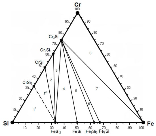 Eight regions have been formed during the triangulation of the ternary Si-Cr-Fe system (Figure 2). However, the Si-CrSi-FeSi2 region has one congruent compound—CrSi2 which resulted in formation of two sub-regions: Si-CrSi2-FeSi2 (1I) and CrSi-FeSi2-CrSi2 (1II). The incongruent compounds have not been observed in regions of CrSi-Cr5Si3-FeSi2 (2), Cr5Si3-Cr3Si-FeSi2 (3), Fe2Si-Cr3Si-FeSi (4), FeSi-Cr3Si-Fe5Si3 (5), Fe5Si3-Cr3Si-Fe2Si (6), Fe2Si-Cr3Si-Fe (7) and Cr3Si-Cr-Fe (8) [].