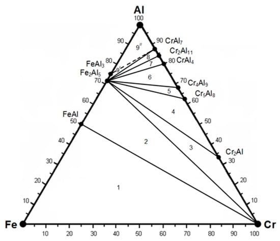The triangulation of the ternary Fe-Al-Cr system (Figure 3) has formed nine regions. The incongruent compounds have not been found in the regions of Fe-FeAl-Cr (1), Fe2Al5-Cr-FeAl (2), Fe2Al5-Cr2Al-Cr (3), Fe2Al5-Cr5Al8-Cr2Al (4), Fe2Al5-Cr4Al9-Cr5Al8 (5), Fe2Al5-CrAl4-Cr4Al9 (6), Fe2Al5-Cr2Al11-CrAl4 (7) and Fe2Al5-CrAl7-Cr2Al11 (8). The Fe2Al5-Al-CrAl7 region has one incongruent compound—FeAl3. This incongruent compound divides this region into two sub-regions, respectively: Fe2Al5-FeAl3-CrAl7 (9I) and FeAl3-Al-CrAl7 (9II).