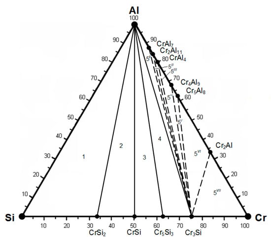 Earlier, the results of the thermodynamic-diagram analysis were confirmed by studying the phase compositions of the complex aluminum–silicon–chrome alloy. The aluminum–silicon–chrome alloy was smelted in a single-stage carbothermic process in an open-type ore-thermal furnace, and the alloy samples were then sent for phase composition determination. In the aforementioned study, the thermodynamic-diagram analysis for the Cr-Fe-Al-Si metallic system was conducted using only congruent compounds, and accordingly, the system consists of 11 tetrahedra [].