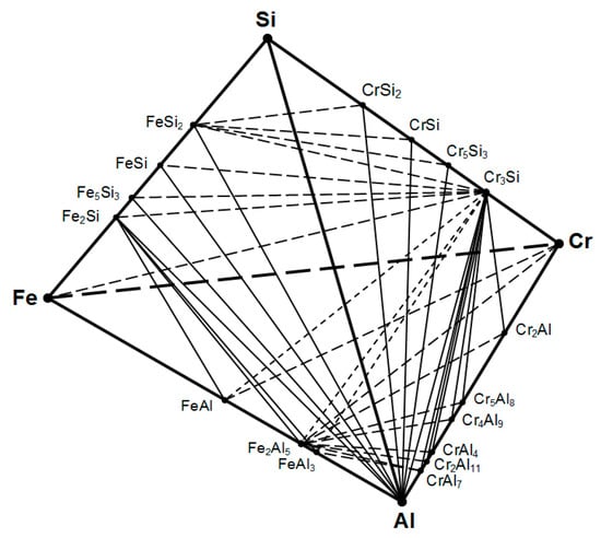 In order to plot a phase diagram of tetrahedration of the Fe-Al-Si-Cr system in the homogeneous liquid state by the thermodynamic-diagram analysis, the Si-Al-Fe, Si-Cr-Fe, Fe-Al-Cr and Si-Al-Cr boundary subsystems have been decomposed into elementary independent triangles. The principle of Gibbs free energy minimization has been used []. If the Gibbs energy change was negative during the reaction between the phases, then the reaction products as the coexisting phases have been connected with a straight line in the diagram. The sequence of this operation leads to a phase equilibrium diagram []. First of all, the metal compounds with the varying complexity forming the studied system should be described.