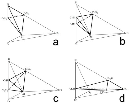 Figure 6 schematically illustrates the phase diagrams of the complex aluminum–silicon–chromium alloy (a) and aluminum–chromium–silicon (ACS) alloy (b, c, d). They have the following average chemical composition after recalculation into four components (Table 12).