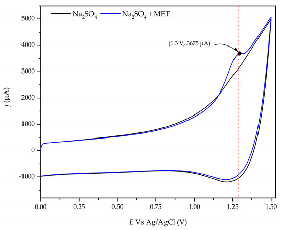 The electrochemical behavior of the aqueous solution containing 50 mg/L of MET on the Nb/BBD anode was studied using cyclic voltammetry measurements. Figure 2 illustrates the cyclic voltammetry of the Na2SO4 (black line) and Na2SO4 + MET (blue line) with the Nb/BDD anode at a potential scan rate of 100 mV/s. This figure exhibits the typical hysteresis behavior of a non-reversible system when wastewater contains MET, with a well-delineated peak at around +1.3 V, indicating that MET is directly oxidized on the Nb/BDD anode’s surface. Also, when the potential is increasing, a smoothed current signal is seen after the peak at +1.3 V, indicating a signal of the oxidation byproducts from MET. Furthermore, these intermediates could be directly oxidized by the free heterogeneous radicals (●OH) on the Nb/BDD anode’s surface [54,55] and other oxidants (e.g., sulfate radicals and persulfate ions) present in the aqueous medium because Na2SO4 was utilized as the electrolyte support [56,57,58], which could contribute to the fast degradation/mineralization of organic pollutants, such as MET, in synthetic wastewater. The formation of sulfate radicals and the persulfate ions formed on the Nb/BDD anode follow the reaction mechanisms given by Equations (14)–(17) [23,26,59,60]: